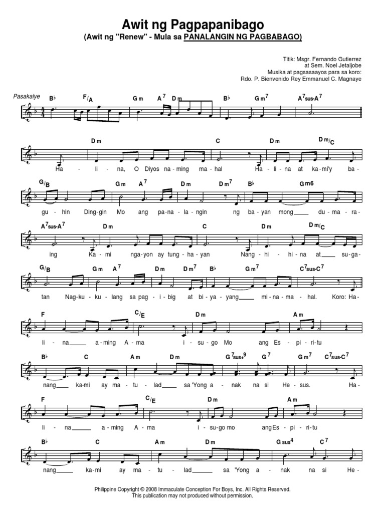 Play Awit Ng Pagpapanibago Song by Lito Magnaye from the Tagalog album LITO MAGNAYE Vol. Bb-FA-Gm-A7-Dm-Bb-Gm7-A7sus-A7 Verse 1 Dm C Halina O D yos naming mahal Dm DmC GB Halina at kami y baguhin. Bb Dm Gm A C F G Am Bm D Em Chords for Awit Ng Pagpapanibago with song key BPM capo transposer play along with guitar piano ukulele mandolin.