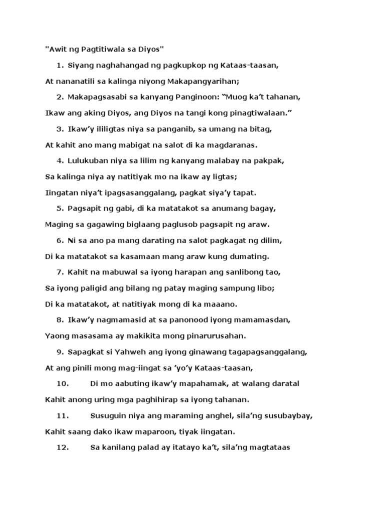 Binalot ng dilim ang langit Kinapos ng liwanag Pagtitiwala koy. Awit ng Pagtitiwala sa Diyos 1 Siyang naghahangad ng pagkupkop ng Kataas-taasan At nananatili sa kalinga niyong Makapangyarihan. SALMO 91 - Awit ng Pagtitiwala sa Diyos.