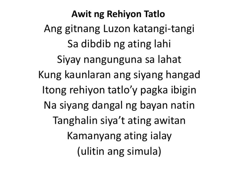 Awit ng rehiyon 3 vlyrics. REVISITING FOLK SONGS OF REGION 3. 100 1 100 found this document useful 1 vote 15K views 1 page. Awit ng rehiyon 3 lyrics.