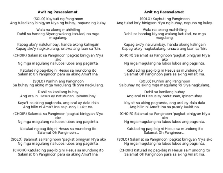 A Lyric Video about Awit ng Pasasalamat song by Hope Filipino WorshipHope Filipino Worship Channel. Kahit buhay ko nalamang ang ibibigay Sayo. Ito ang aming awit ng pasasalamat Inibig Mo kahit hindi karapat-dapat Ito ang aming awit ng pasasalamat Papurit pagsamba saYo ay nararapat Verse 1 Ako ay aawit Sayo o Panginoon Itataas ko ang pangalan Mo Papurit pagsambay SaYo lamang iaalay Akoy inibig Mo Verse 2 Ako ay aawit Sayo o Panginoon Walang katulad ang pag-ibig Mo.